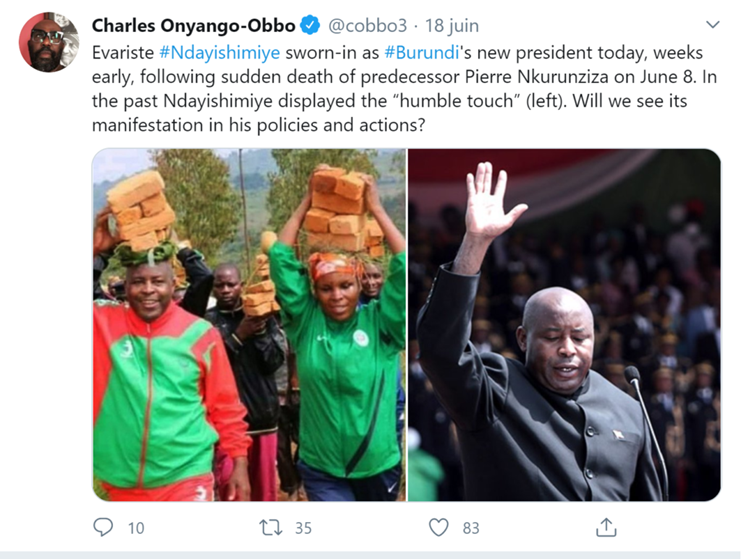 Ainsi après son investiture, cette publication en date du 7 juillet 2020 présente une image sur laquelle on voit Evariste Ndayishimiye et sa femme portant des briques sur leur tête; on peut également lire : « l’actuel président du Burundi en compagnie de sa femme au service humanitaire du 4 juillet 2020 ».