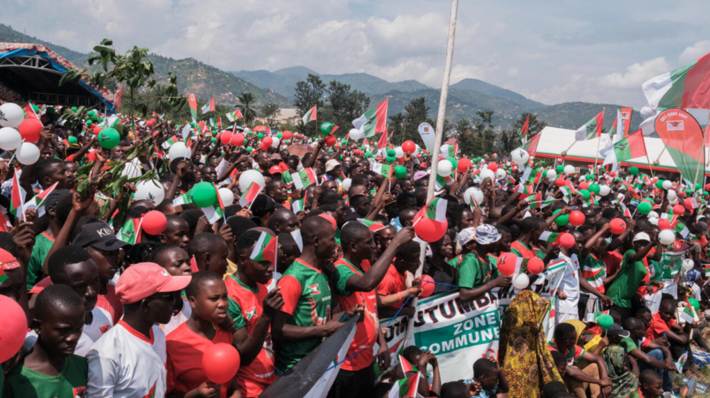 Photo : Des membres du parti au pouvoir Cndd-FDD rassemblés lors de la campagne pour les législatives, les sénatoriales et les communales à Bujumbura, le 31 mai 2025. © AFP/RFI